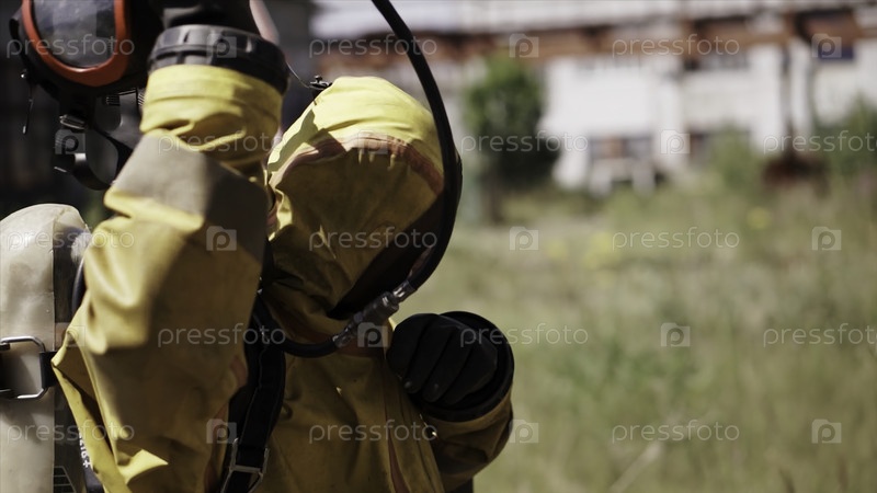 Пожарный в униформе. клип. взрослый мужчина с шлемом и маской, который стоит на улице и готовится к работе. высокое качество FullHD кадры