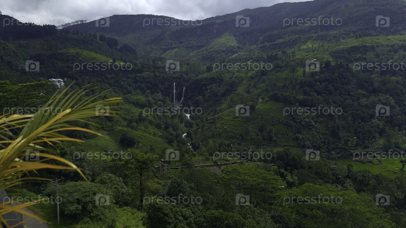 Прекрасный вид на тропическую горную долину. Действие. Зеленые тропические леса с горами и реками. Красивый вид на долину с лесами и горами в пасмурную летнюю погоду