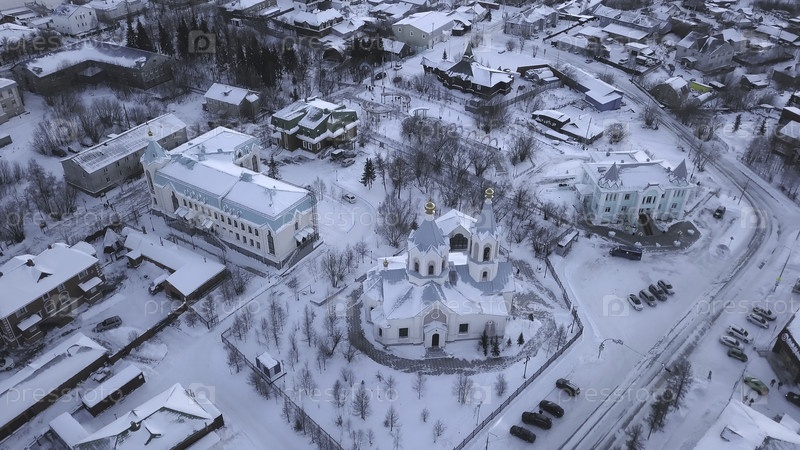Вид сверху зимнего города. Клип. Пейзаж зимнего города с церковью в пасмурный день. Снежные улицы зимнего города в пасмурный день