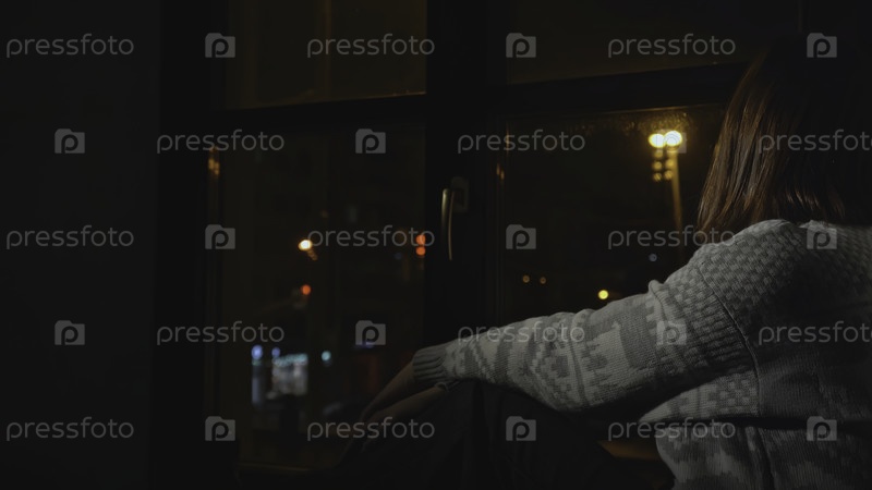 Женщина с депрессией смотрит из окна дома.СМИ.Женщина с тревожным расстройством сидит на лошади и грустная.Женщина в свитере сидит одна на окне