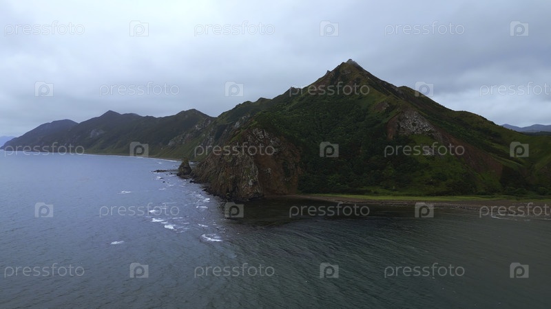 Вид сверху горного побережья со скалами в пасмурный день. Клип. Красивый пейзаж моря и горного острова в пасмурную погоду. Увлекательный ландшафт северного побережья с морем и скалами