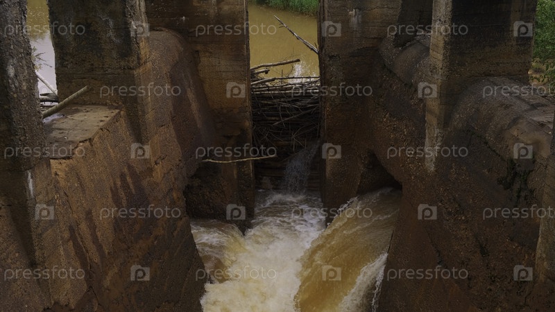 Старый заброшенный дамба с грязной водой на реке. клип. старая каменная плотина на реке с ржавой водой. разрушена каменная плотина на реке летом