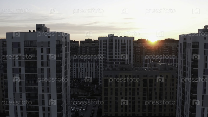 Вид с вершины красивого городского района на закате. Скриншоты. Жилые многоэтажные дома в современном районе города при закате солнца. Красивая панорама жилого района со зданиями на фоне сумерек