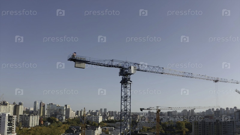 Вид сверху строительного крана на фоне города в солнечный день. Стоковые кадры. Строительные краны на высоте с видом на город к горизонту. Строительный кран на фоне современного города в солнечный летний день