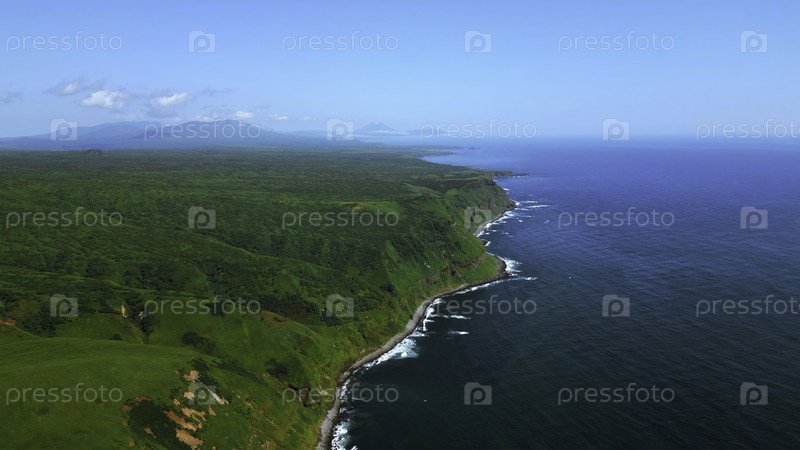 Зеленые поля, луга, лето синее небо и спокойное море. Клип. Живописная сельская местность морской пейзаж с зелеными лесистыми скалами