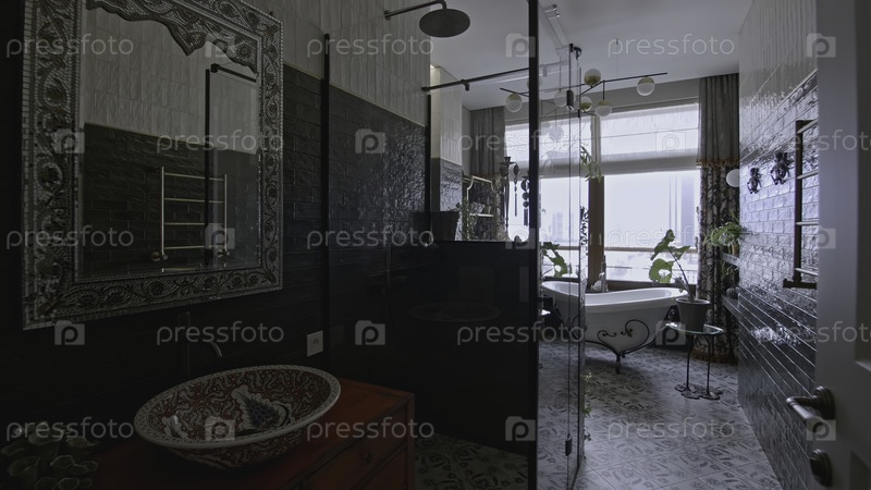 Стильный дизайн ванной комнаты с современными бытовыми приборами. креативность. красивые дизайнерские решения в роскошном интерьере ванной комнаты. дорогая ванная комната с зелеными оттенками плитки