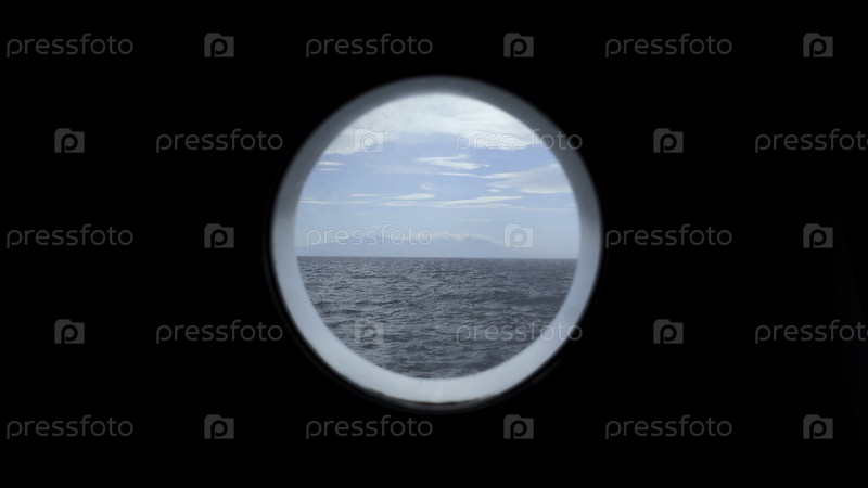 Вид с окна круглой палубы на море. Клип. Красивый морской пейзаж с горным побережьем на горизонте из круглого окна. Морское путешествие и вид из круглого окна