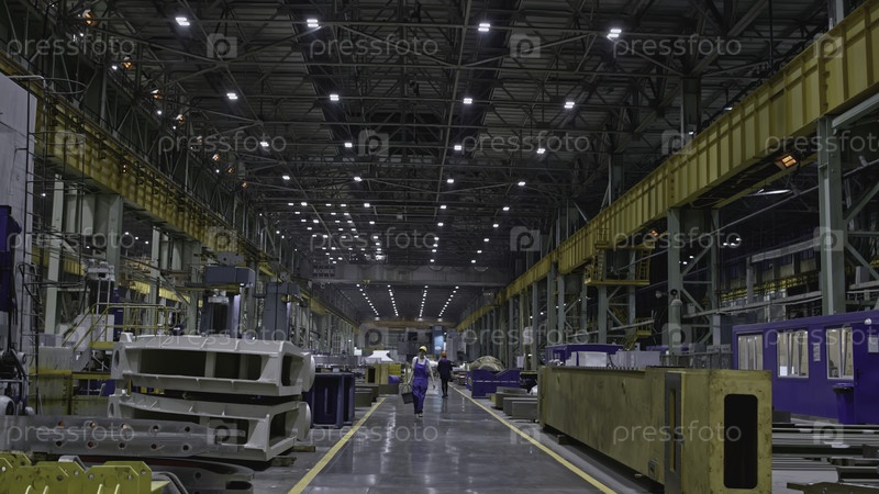 Вид на заводский этаж с рабочими. Запасный клип. Помещения промышленной деревообрабатывающей мастерской с работниками. Коридор огромного цеха с ходящими рабочими и машинами