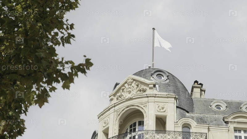 Париж, Франция - 29 июля 2022: Нижний вид старого европейского дома с зеленым деревом. Действие. Экстерьер старого здания со флагом Apple в Париже. Дом на Елисейских полях с магазином Apple Store