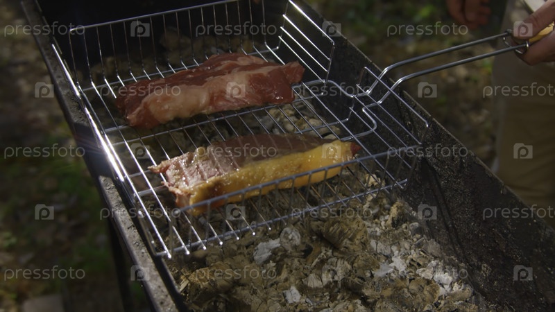 Близкий снимок мужчины, готовящего сочные кусочки мяса на гриле. Скриншоты. Мужчина готовит два вкусных куска красного мяса на углях. Жарка мяса на свежем воздухе летом