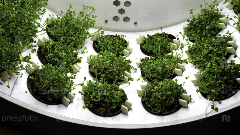 Закрытие промышленной прядильной фермы для прорастания микрозеленых растений. СМИ. Ряд небольших контейнеров с растительностью под яркими лампами