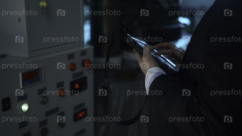 Ближайшее изображение планшета управления промышленным оборудованием. Фрагмент кадров. Человек нажимает на планшет контроля промышленного оборудования. Руководящий инженер устанавливает задачи для оборудования на планшете