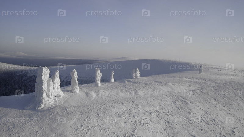 Летающие над снегом покрытые необычные колонны на фоне чистого синего неба. Клип. Лес и заснеженная долина