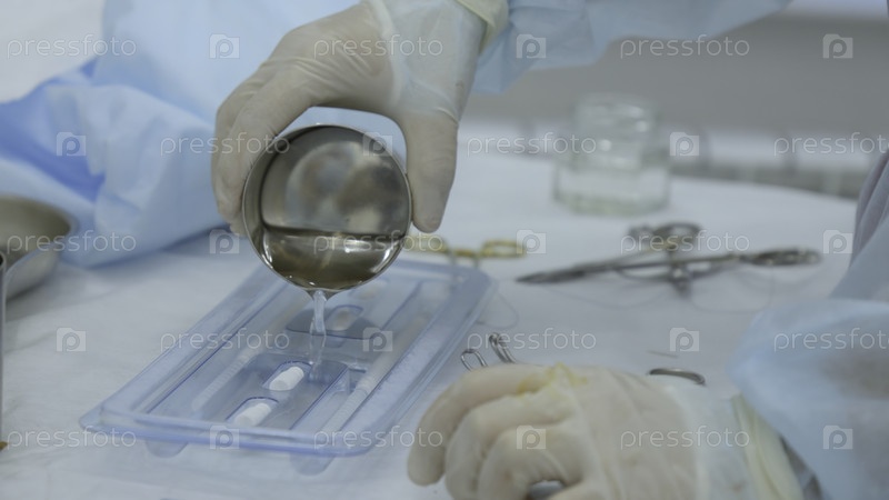 Работник лаборатории наливает дезинфицирующую жидкость в плоскую колбу.Действие.Концепция химии и науки