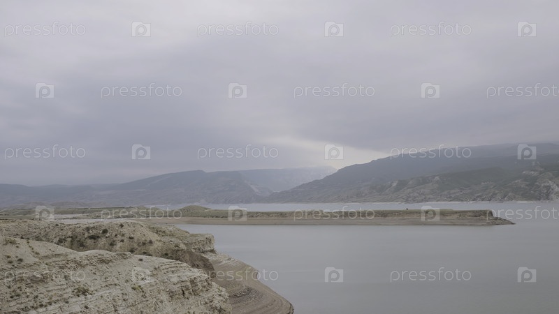 Спокойная поверхность морской воды и каменные образования. Действие. Голубое летнее море и галечный берег на фоне облачного неба