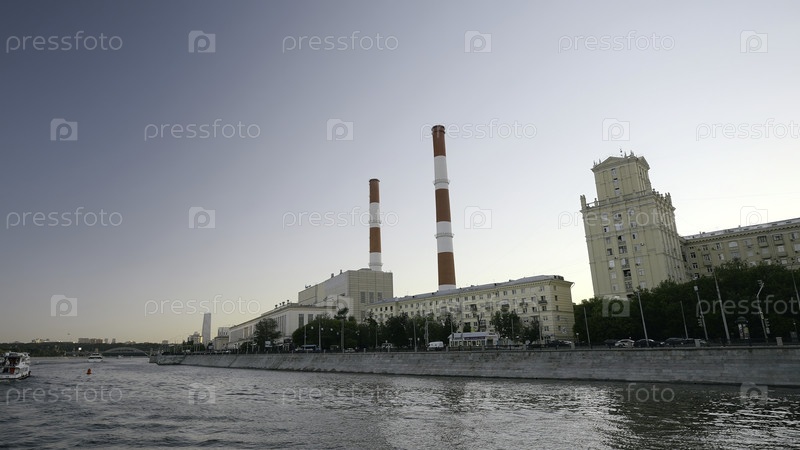 Городской пейзаж. Вид с речной прогулки. Действие. Красивый вечер города с домами вдоль реки, церковью и фабриками