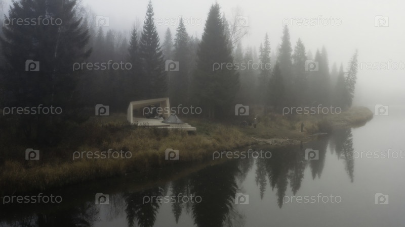 Тихое место для рыбалки и походов. клип. туманный вид на реку и берег для палаток и отдыха. высокое качество 4k кадры