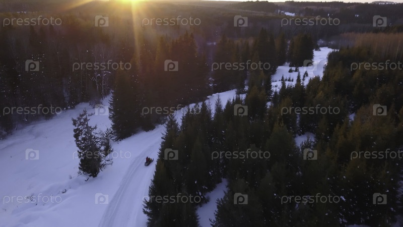 Зимний снежный солнечный день. Вид с беспилотника. Клип. Яркая зима со скутером, едущим по дорогам и зеленым елкам. Высокое качество 4k кадры