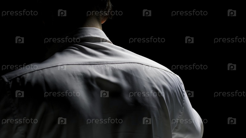 Сзади мужчина надевает белую рубашку, изолированную на черном фоне