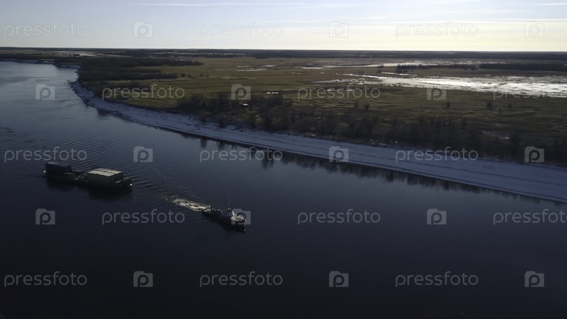 Речной буксир с баржей.Клип.Вид сверху баржи, плавающей с грузом на реке.Речный буксир живописно плывет на фоне горизонта в солнечный день