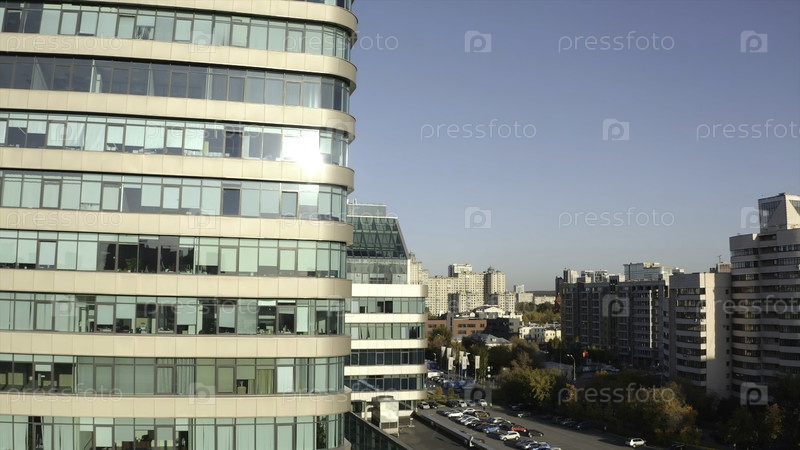 Вид с вершины стеклянных небоскребов в городе в солнечный летний день. Фрагмент кадров. Красивая архитектура современных стеклянных небоскребов. Современная архитектура офисных высот в городе