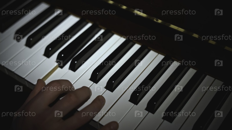 Ближайшее изображение руки, играющей на фортепиано. СМИ. Свет падает на руку, играющую на фортепиано. Одинокая рука играет ноты на пианино