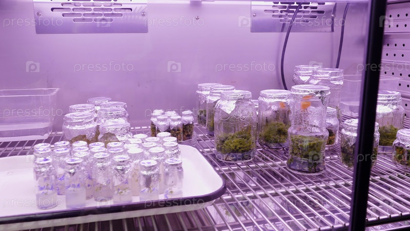 Холодильник в лаборатории с пустыми колбами и зелеными растениями