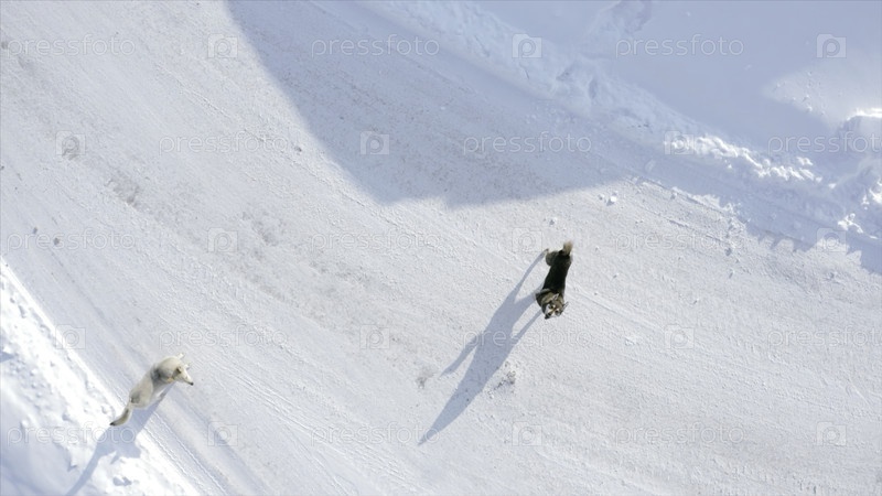 Зимние бродячие собаки. Клип. Вид сверху лысящих собак зимой. Собаки лают на квадрокоптер в солнечный зимний день