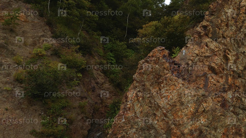 Вид сверху на скалистый хребет с лесным ущельем. КЛИП. Удивительная природа с каменистыми склонами зеленого ущелья. Кинематические скалы со зелёными деревьями в ущелье
