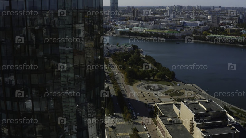 Вид сверху стеклянного фасада многоэтажного здания с ландшафтом города и реки. Фрагмент кадров. Красивый пейзаж современного города со стеклянными зданиями. Стеклянные небоскребы с зелеными пейзажами летнего города с рекой