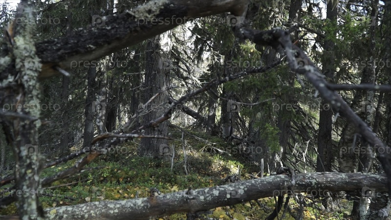 Сухие ветви старых деревьев на фоне леса и зеленого мха. Клип. Лишайки на деревьях в лесу в солнечный день. Мох и лишайки с сухими деревьями в лесу