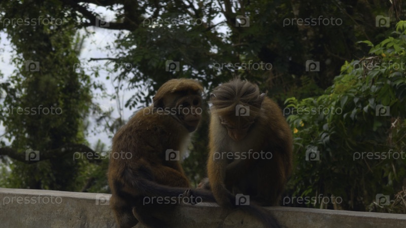 Красивые красные обезьяны в тропическом парке. Акция. Дикие обезьянки на пешеходных маршрутах в джунглях. Прекрасные игривые обезьянки в тропических местах