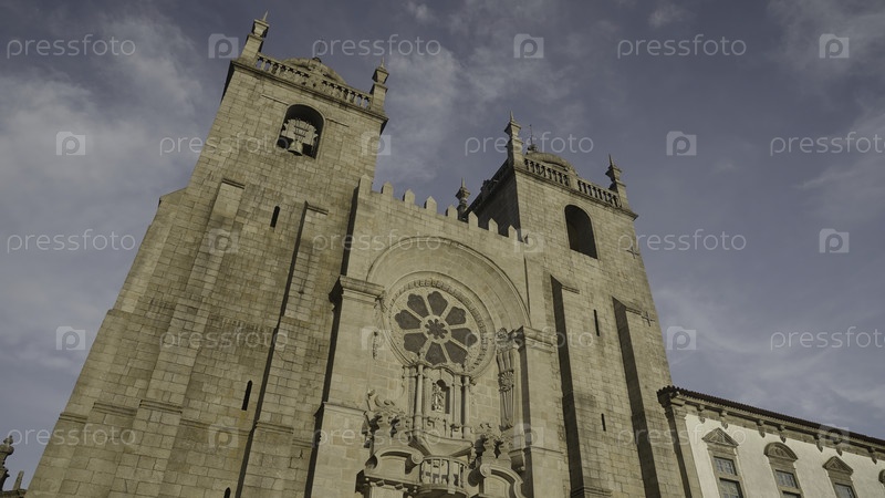 Португалия, Порто- 29 июля 2022: Нижний вид древнего каменного собора на фоне неба. Действие. Красивый фасад древнего собора в Португалии. Se Cathedral in Porto