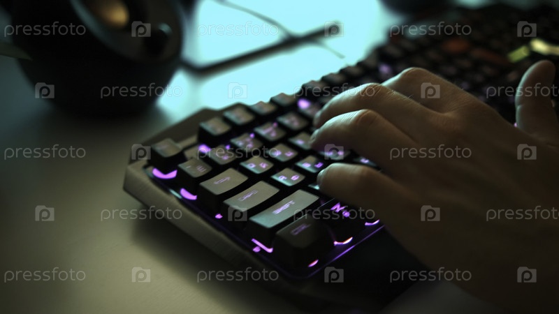 Молодой геймер играет в видеоигру или печатает на красочной клавиатуре, ближе. Клип. Игрок использует игровую освещенную клавиатуру, концепцию киберспорта