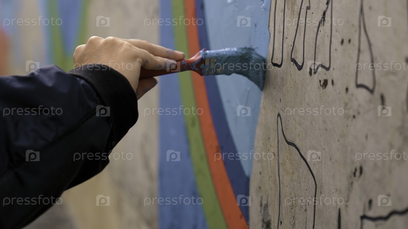 Художник-граффити рисует на стене, экстерьер. Клип. Близость мужской руки с помощью кисти и краски для украшения стены