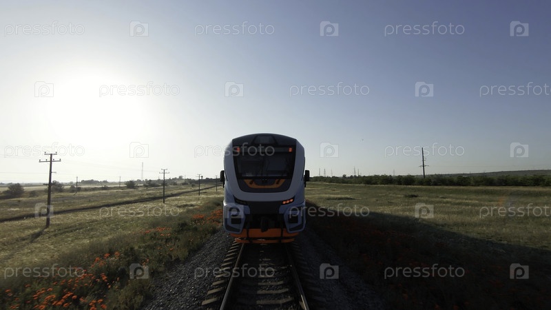 Летний пейзаж с высокоскоростным поездом.Снимок: новый поезд, быстро движущийся на рельсах вокруг травы и пустых полей