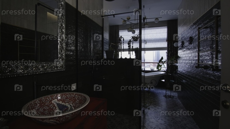 Интерьер ванной комнаты со старыми узорами. креативность. дорогой дизайн современной ванной с историческими узорами в интерьере. дорогостоящий рисунок в деталях интерьера бани