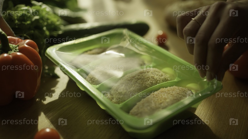 Замороженные полуфабрикаты. Снимок из запасов. Процесс приготовления котлетов с овощами и гарнирными блюдами. Высококачественная запись 4k