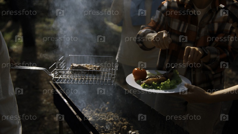 Пикник на природе в лесу барбекю у костра с дымом. запись фильма. мужчина кладет вкусную курицу в тарелку женщины с овощами