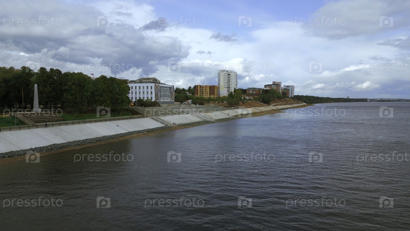 Вид сверху речной набережной города с лесом. Клип. Ландшафтная набережная городского берега реки. Красивый пейзаж речной набережной с городским парком