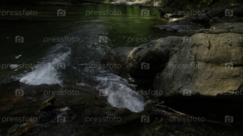 Красивый небольшой водопад и гигантские камни.Креативно.Холодная горная река дикого озера
