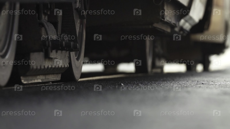 Подробный вид, демонстрирующий колеса промышленных транспортных средств, расположенные на недавно вымощенной и гладкой асфальтной поверхности