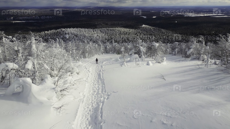 Вид сверху человека, идущего в горы в зимнем лесу. Клип. Человек идет на зимнее походы в горах. Мужчина ходит один вверх по склону зимой в лесу