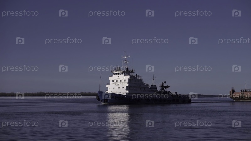 Большая баржа, плавающая и перевозящая грузы.Клип Концепция водного транспорта