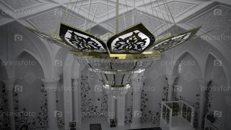 Очень дорогая люстра в шикарном зале.Сцена.Белый красивый интерьер пустого концертного или ресторанного зала