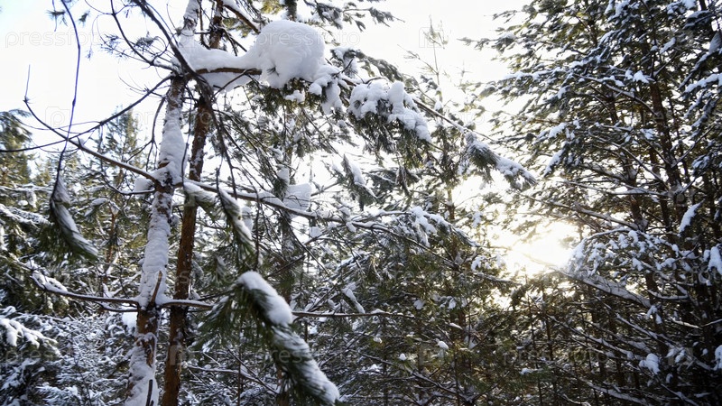 Сосновые ветви с иглами, покрытыми снегом. Клип. Низкий угол взгляда на деревья в зимний солнечный день