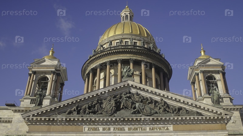 Красивый фасад древнего храма со статуями. Действие. Древняя архитектура с красивыми колоннами и скульптурами собора. Древняя православная церковь с прекрасной архитектурой и скульптурами на фоне голубого неба в солнечный день