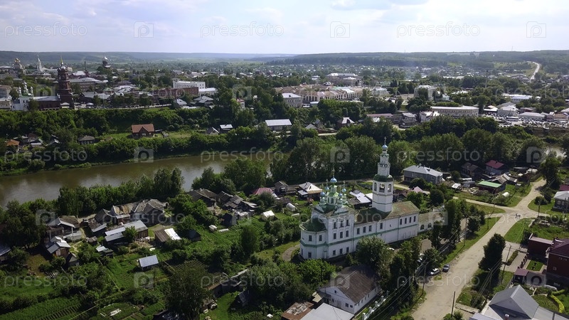 Вид сверху красивой церкви в городе на берегу реки летом. Клип. Старая красочная церковь в городе у реки в солнечный день. Красивый пейзаж города с рекой и древними церквями летом