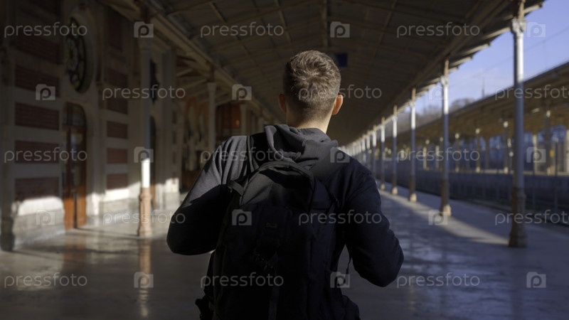 Молодой человек с рюкзаком, идущий вдоль пустой железнодорожной станции