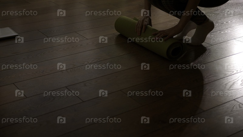 Женщина готовится к спортивным упражнениям дома.Сток-фильмы.Женщина кладет коврик для йоги на пол